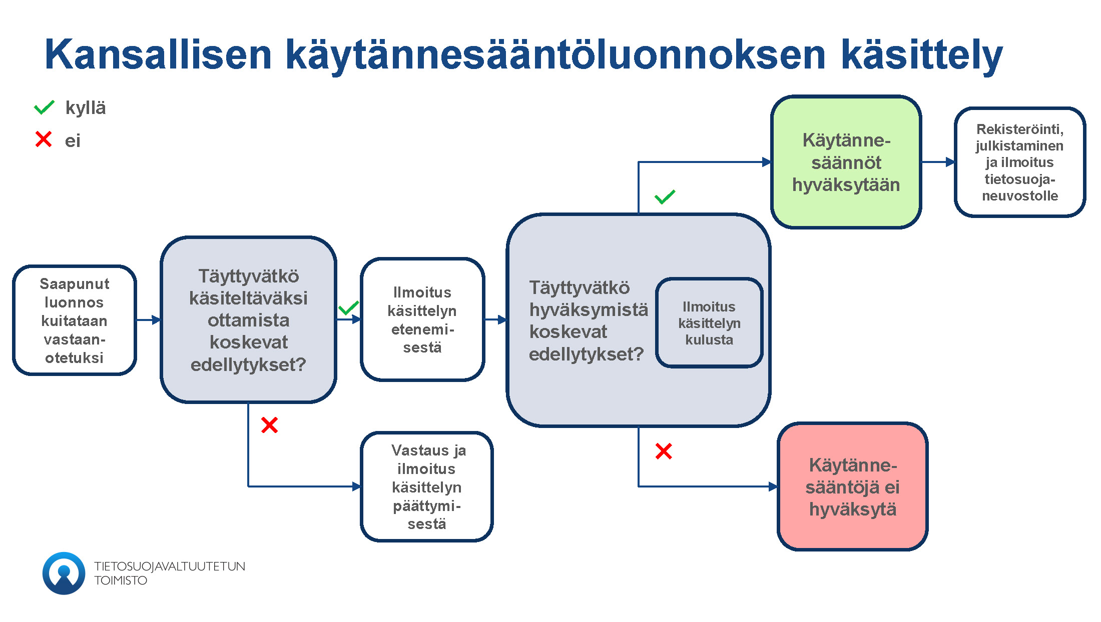 - Jos edellytykset täyttyvät, tietosuojavaltuutetun toimisto ilmoittaa käytännesääntöluonnoksen laatijalle luonnoksen hyväksymisestä käytännesäännöiksi.