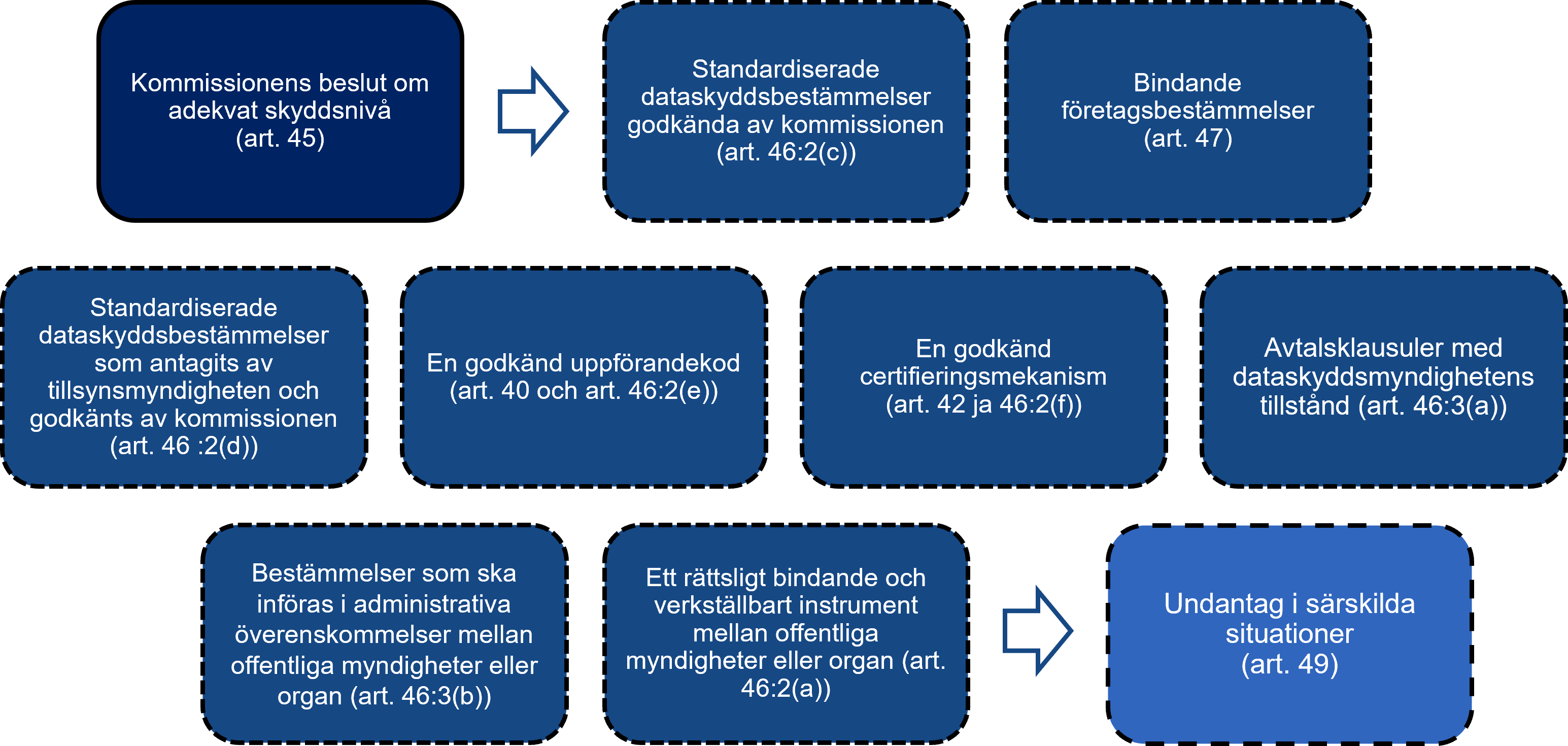 Om du överför personuppgifter till länder utanför Europeiska ekonomiska samarbetsområdet, behövs en grund för överföringen som är förenlig med kapitel V i EU:s allmänna dataskyddsförordning. Kom ihåg prioritetsordningen för överföringsgrunderna när du utreder vilken grund som vore lämplig.