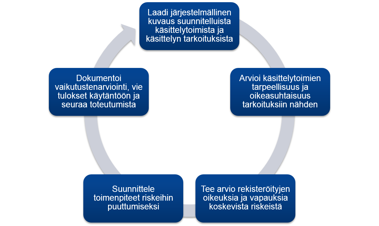 - Tee riskiarvio, jonka keskiössä ovat suunniteltuun henkilötietojen käsittelyyn liittyvät rekisteröidyn oikeudet ja vapaudet sekä niihin kohdistavat riskit.